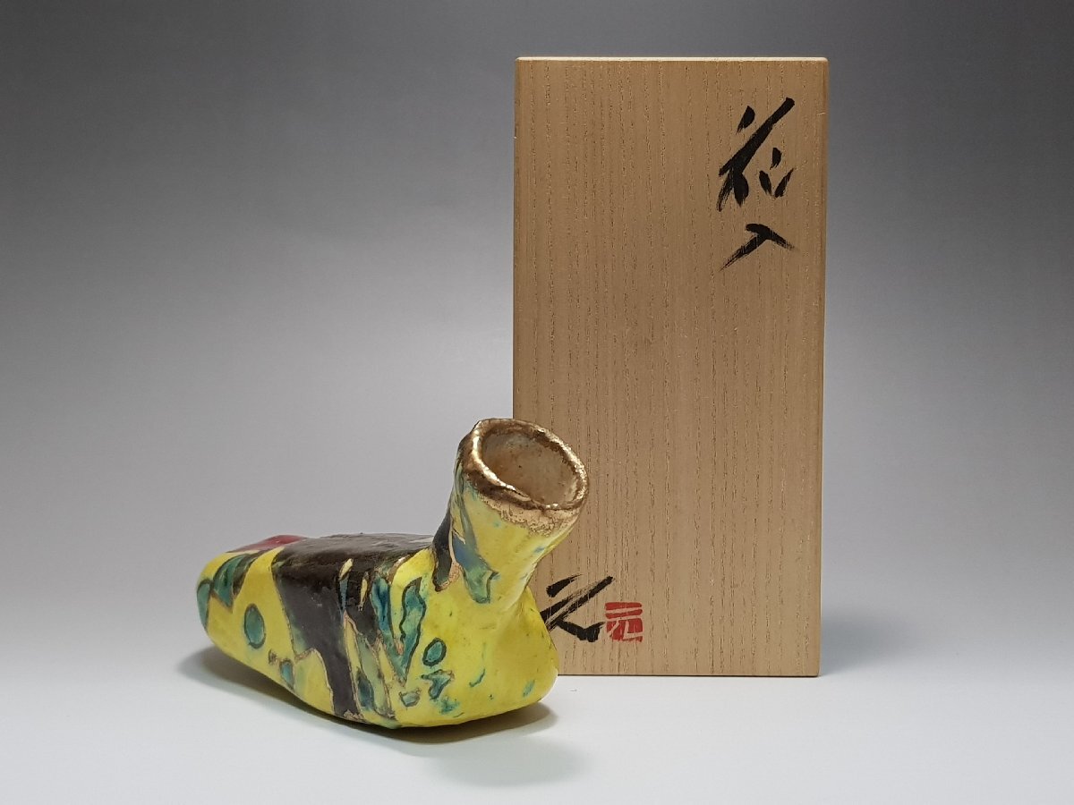- 上野焼 高鶴元 金彩 色絵 花入 花瓶 花器 共箱 茶道具 幅約16.6cm / 花瓶 飾瓶 花插 花器 壷 壺 唐物 古玩 古董
