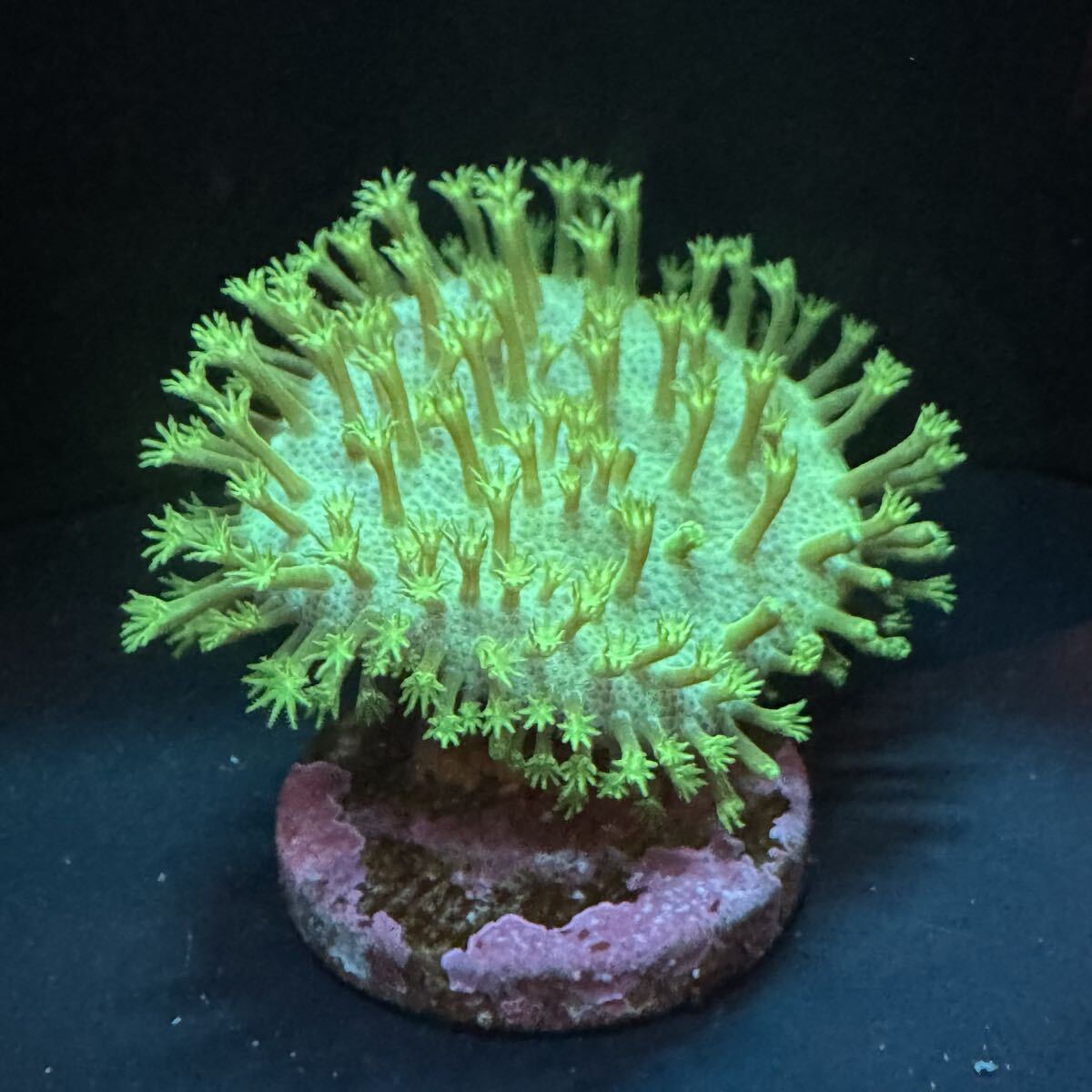 > ③ ウミキノコ メタリックグリーン ベースグリーン ポリプグリーン ポリプ長め サンゴ 約2.8 から 約3cm プラグ フラグ 最大幅約4cm程度