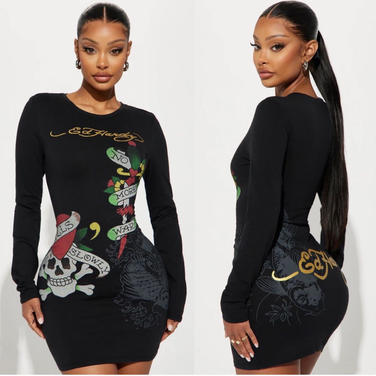 > 新品 未使用Ed Hardy LOVE KILLS SLOWLY Tシャツ ワンピース Tシャツ ブラック Size:M 長袖