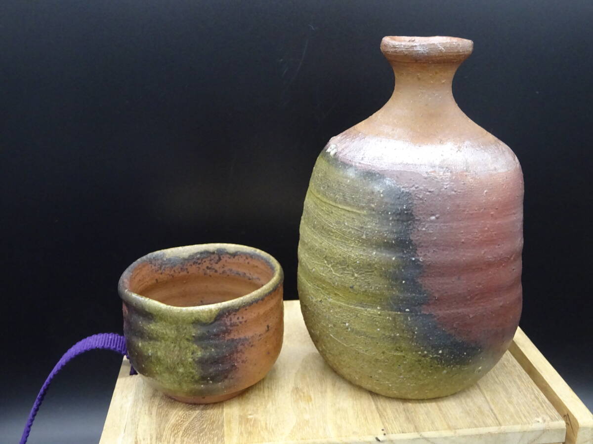 - 備前焼 女流人気実力作家 川井明子(初代小西陶古の三女)★備前窯変徳利・ぐいのみセット 共箱、黄布、陶歴付 酒器 茶碗 壺 茶道具