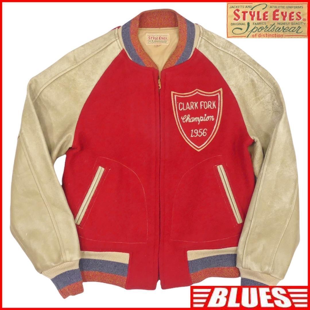 > 即決★STYLE EYES★メンズM レザーアームスタジャン 東洋エンタープライズ スタイルアイズ 38 赤 ベージュ 本革 ブルゾン ジャンパー