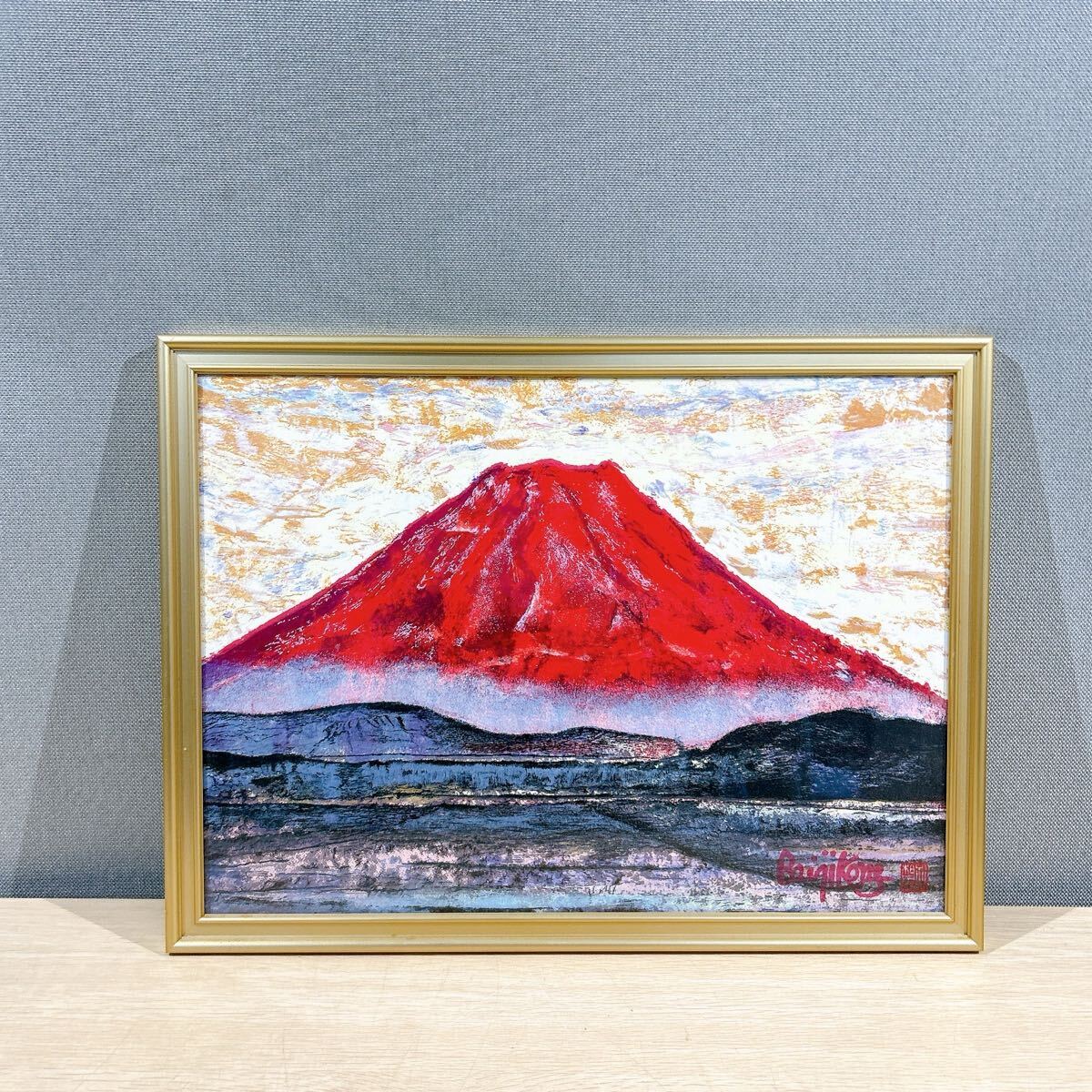 - ★プリント画 孔 栢基 ”幸福紅富士” 額装 絵画 美術品 アート 幅46.5cm 縦34.5cm 縁起物