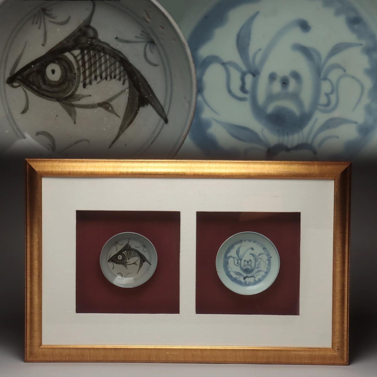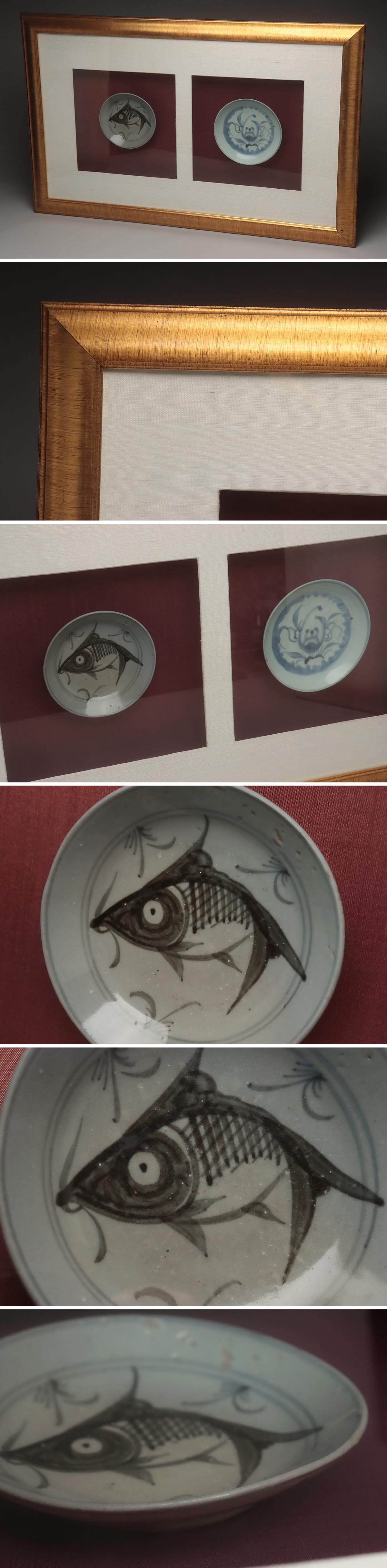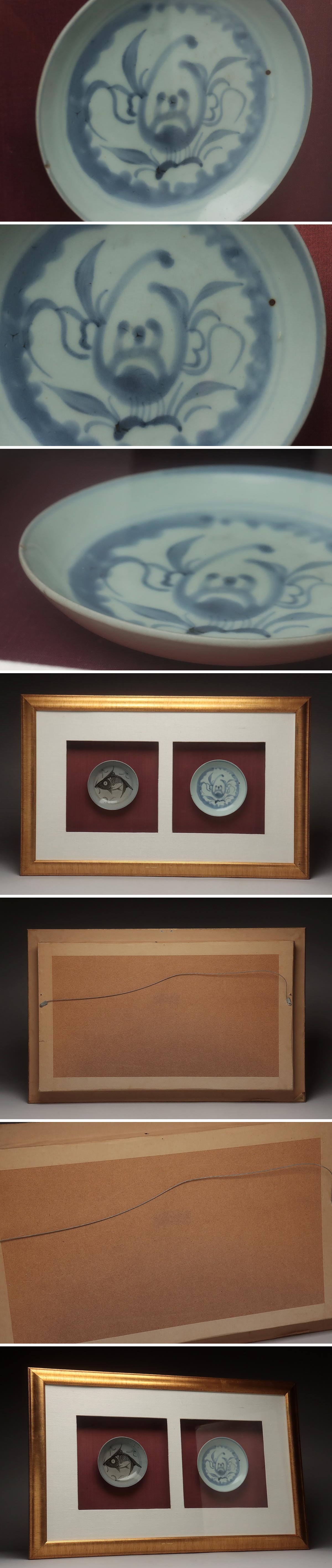 - DT477 中国古美術 唐物「古染付魚文/草花文皿」額装 横74.5cm 重4.1kg・青花魚/花卉紋賞盤 挂屏 中国古陶磁 中国古玩