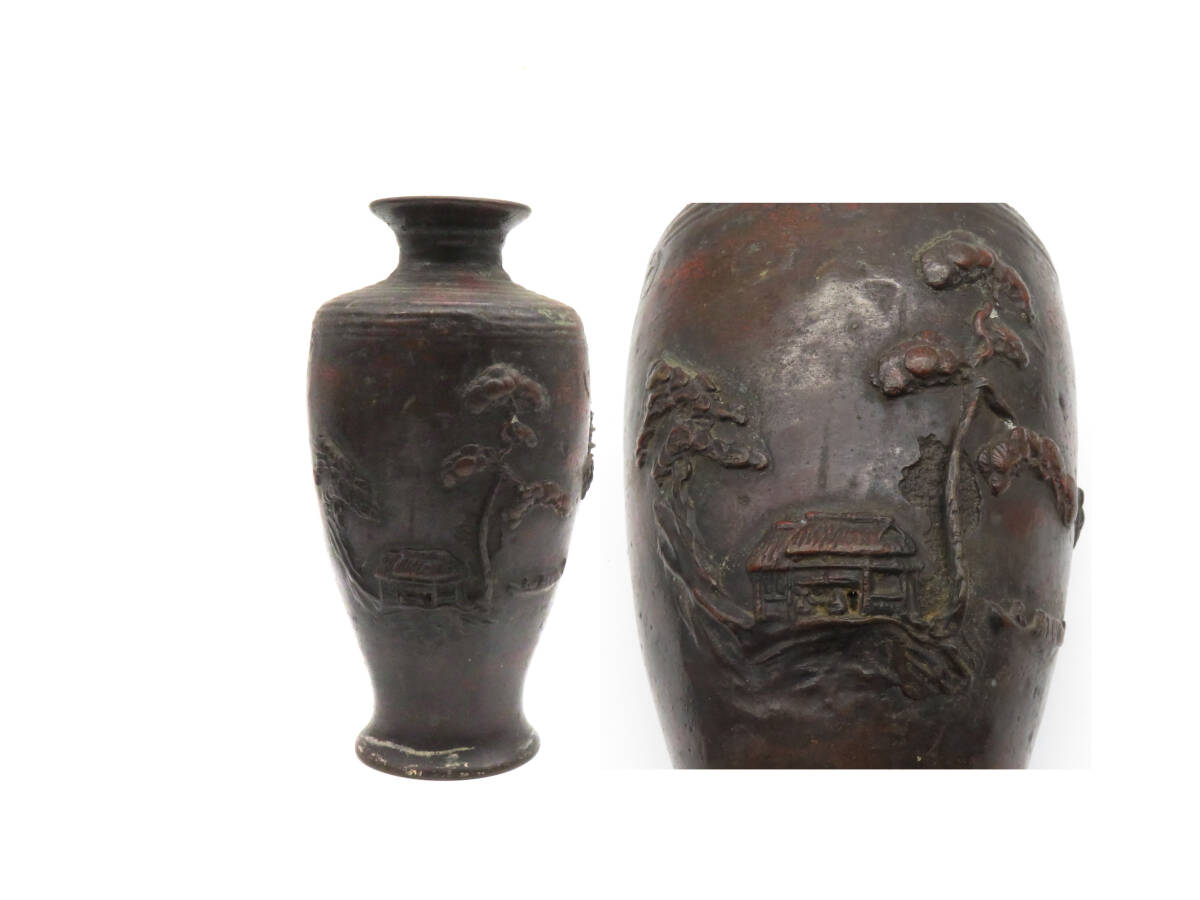 > K8811 斑紫銅 山楼閣浮彫 銅花瓶 花生 花入 銅製 銅器 重さ約505.7g 金属工芸 古美術 時代物 茶道具 鉄瓶
