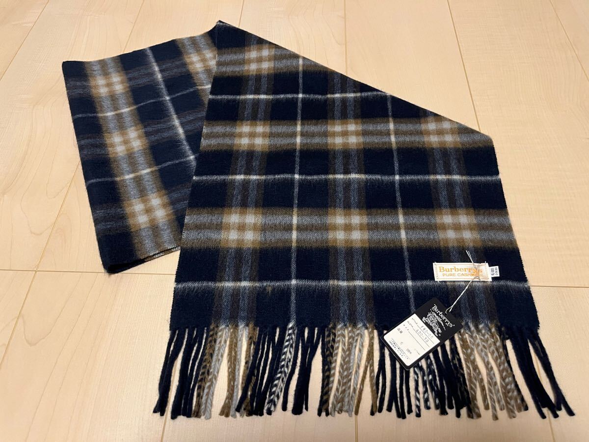> BURBERRY バーバリー マフラー カシミア100% タグ付き未使用品 濃紺 ネイビー系 送料無料!!