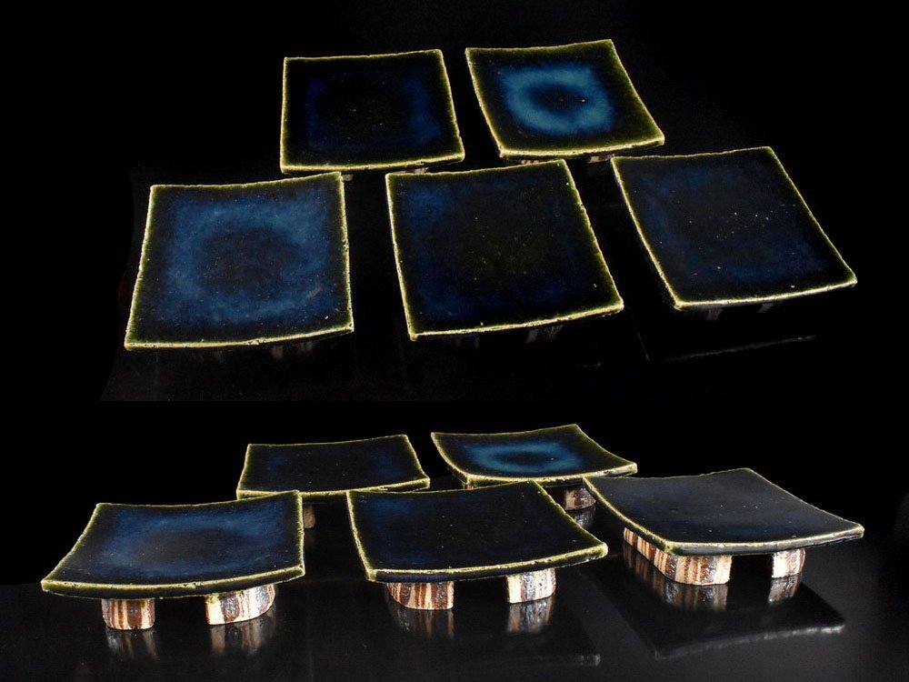 - 【雲】某名家収蔵品 古瀬戸窯 加藤作助造 織部 高台角皿 四方皿 5客 直径11cm 古美術品(懐石料理道具)AY5918 CTDkmnh
