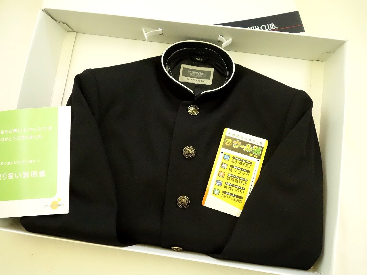 > ★未使用保管品!男子学生服 詰め襟 Youth club 150A(ウール混 丸洗いOK 撥水 撥油加工 純ブラック 静電気防止 ソフト襟カラー