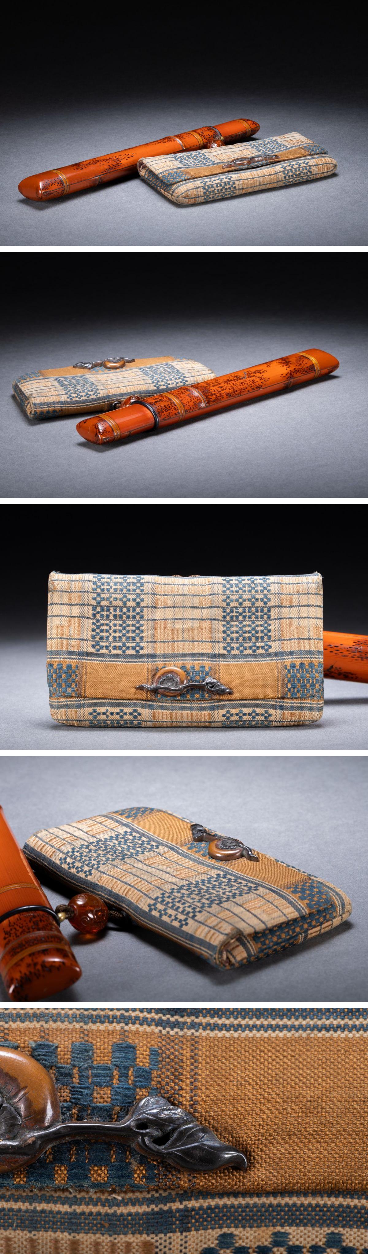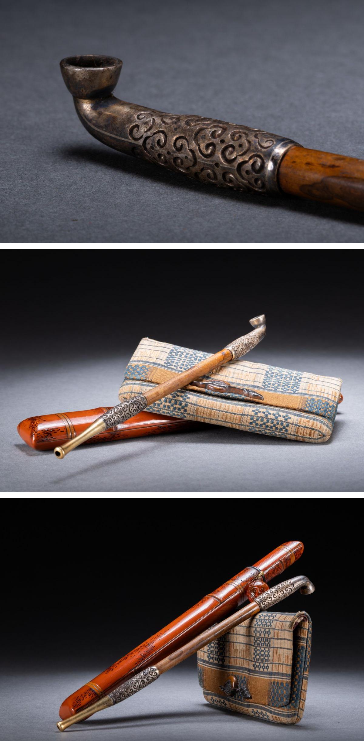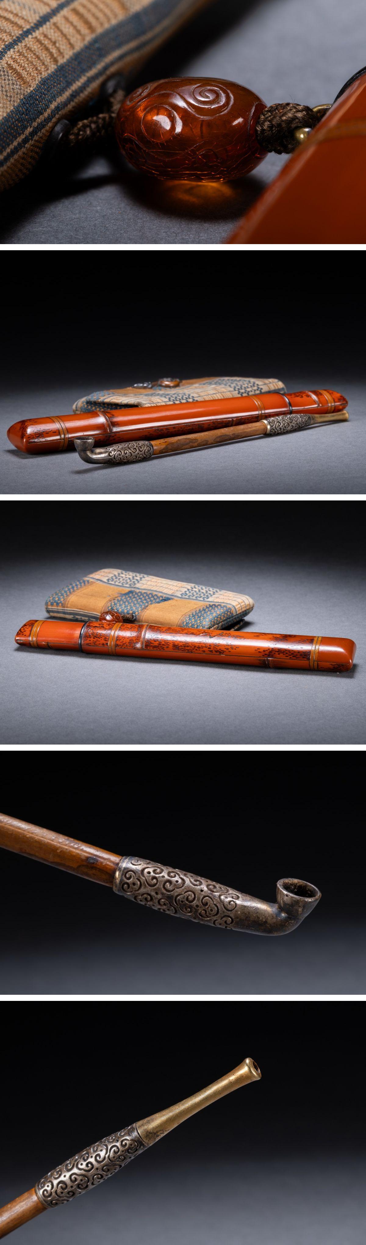 - 【雲錦】某有名オークション購入 江戸時代 漆塗煙管筒・純銀祥雲文煙管・金唐革煙草入 琥珀根付 古置物 古擺件 古美術 時代コレクションWK9