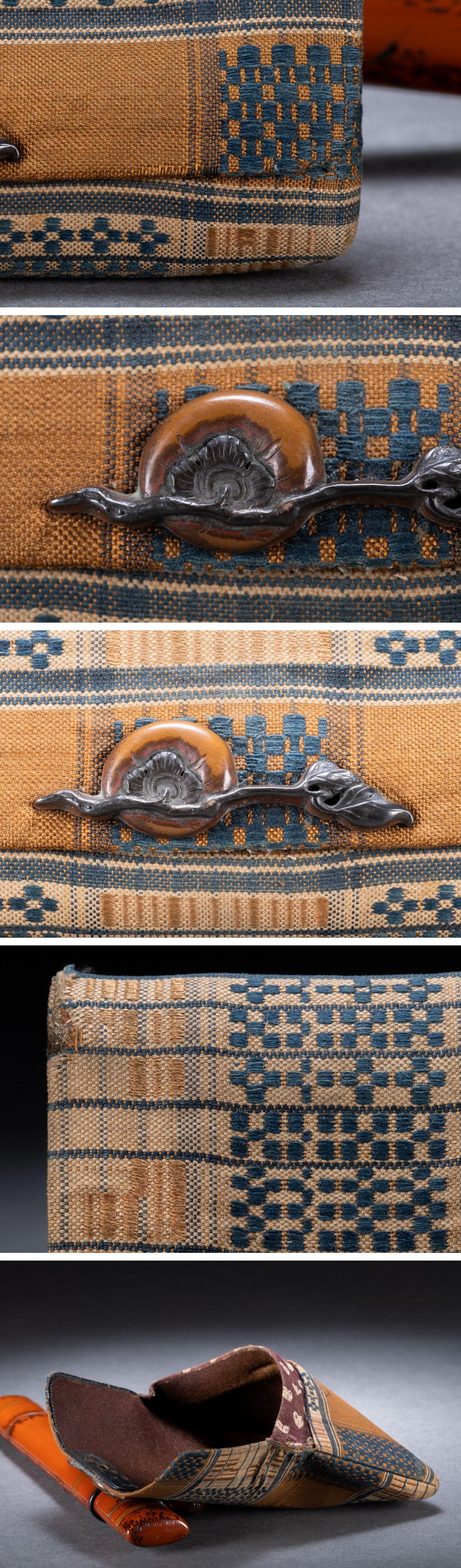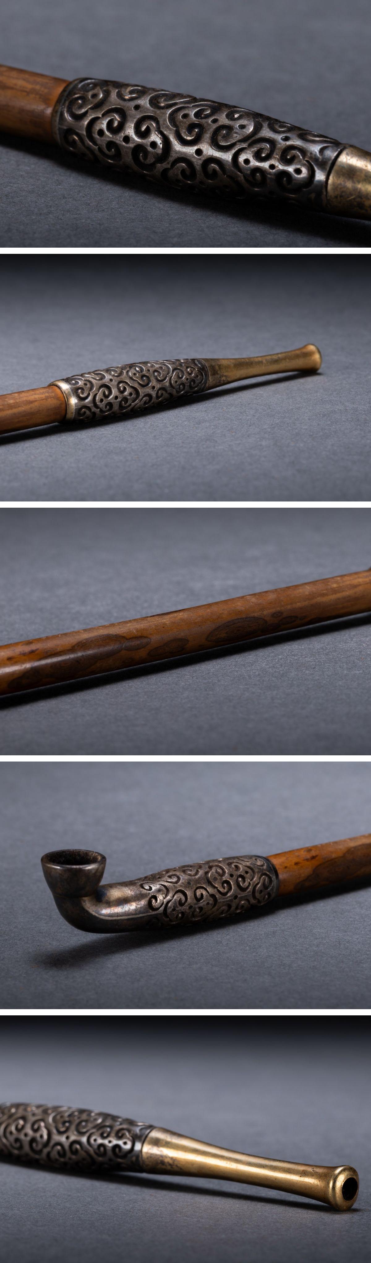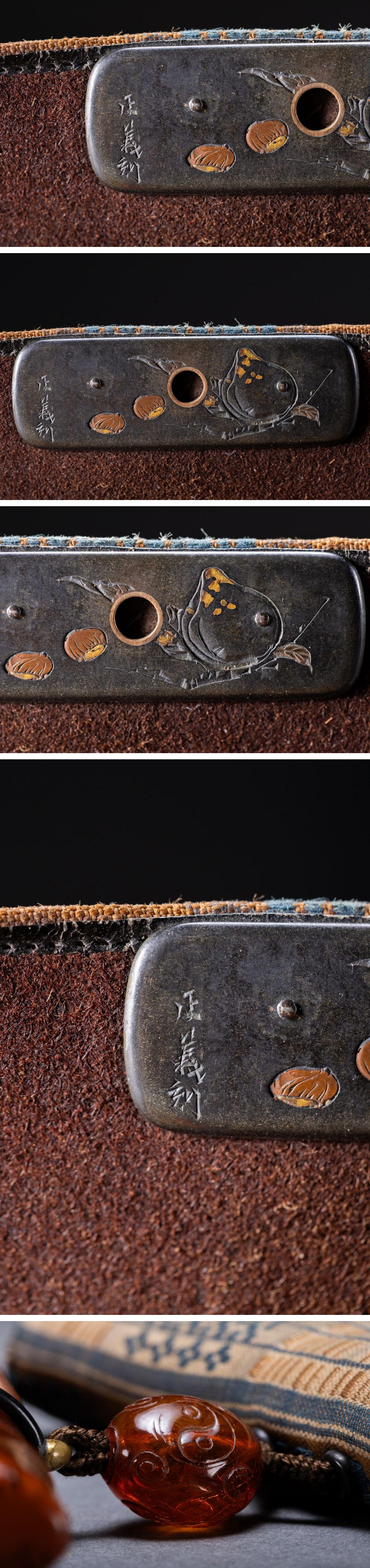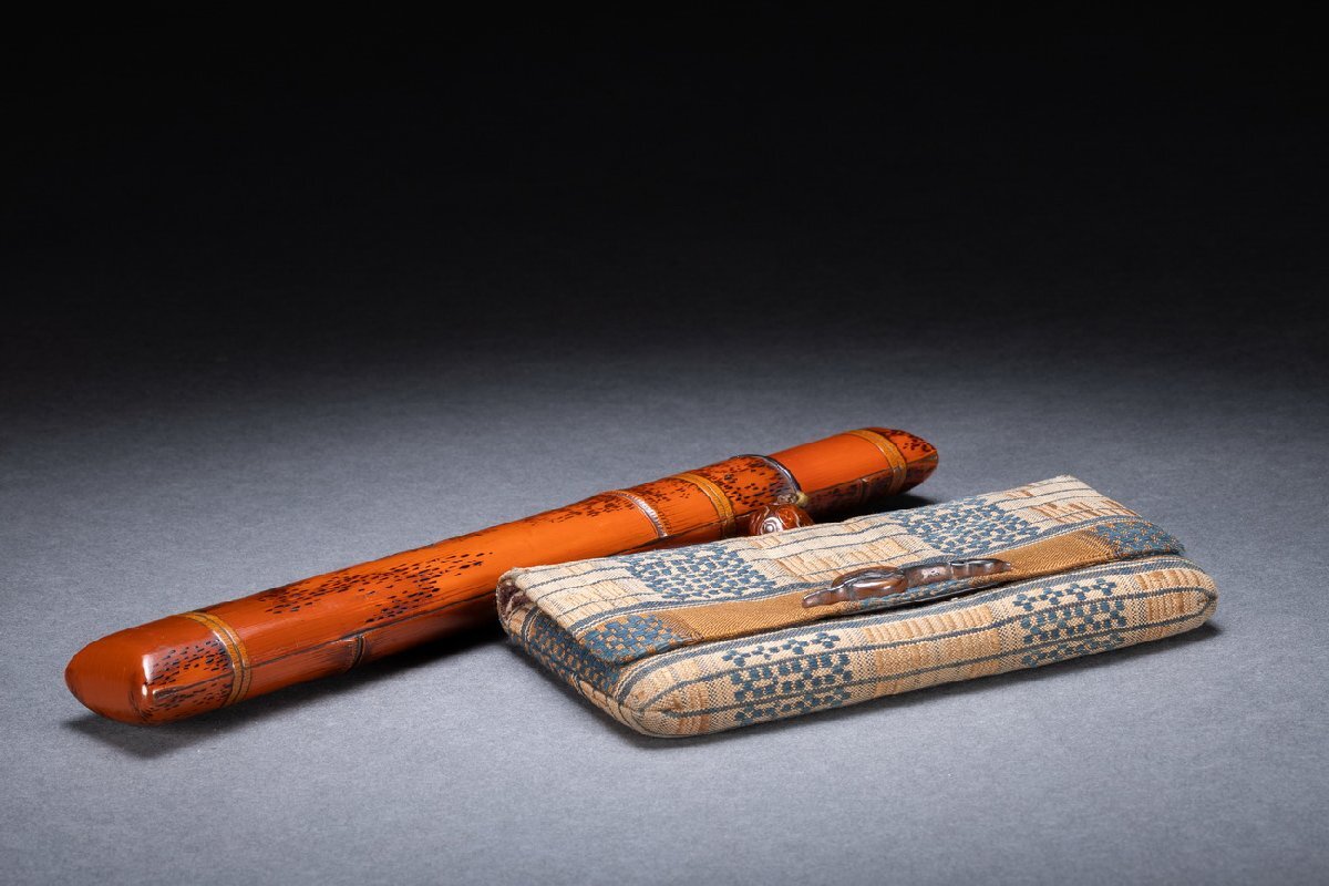 - 【雲錦】某有名オークション購入 江戸時代 漆塗煙管筒・純銀祥雲文煙管・金唐革煙草入 琥珀根付 古置物 古擺件 古美術 時代コレクションWK9