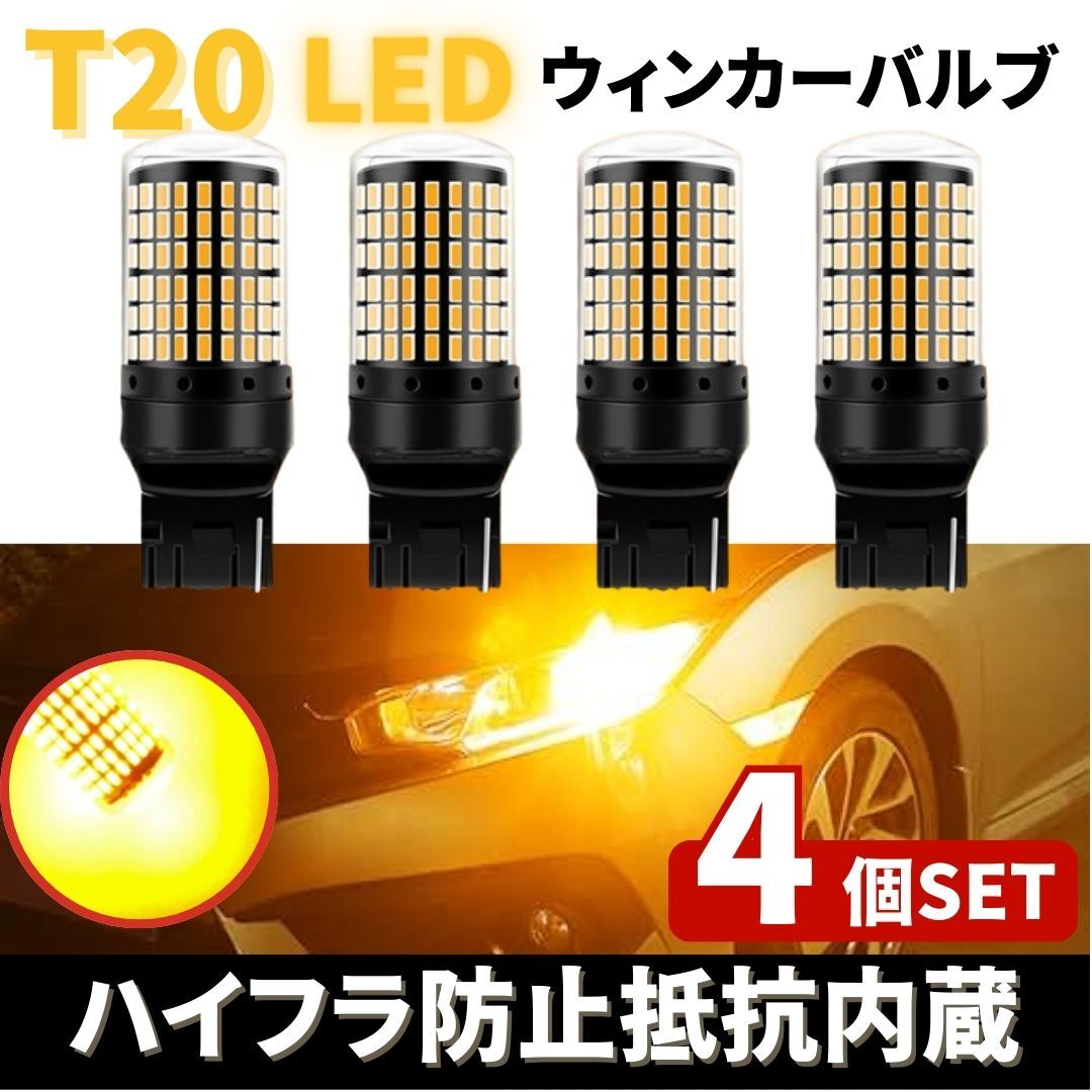- T20 LED ウィンカー バルブ アンバー 4個 オレンジ 12V 144灯 ハイフラ防止 抵抗内蔵平行ピン キャンセラー ウェッジ ライト 無極性 爆光車