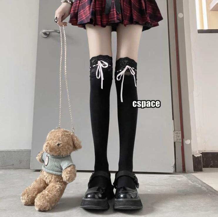 - 新品 ニーハイソックス リボン 靴下 かわいい セクシー ロリータ メイド ハロウィン 仮装 地雷系 ゴスロリ ブラック 黒