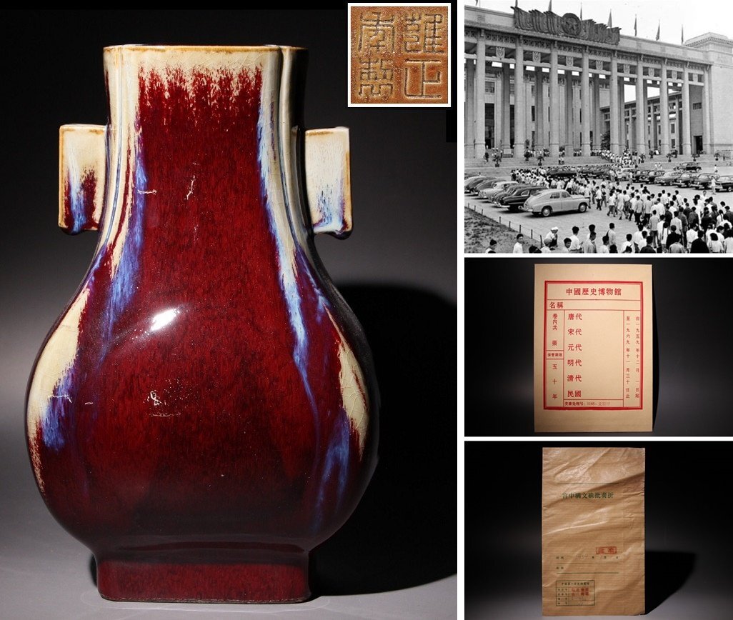 > 中国歴史博物館由来 宮中満文批奏折付 45 雍正年製 辰砂釉管耳瓶 高さ約27.7cm (検)管耳瓶 紅釉 赤釉 辰砂 花瓶 唐物 中国美術