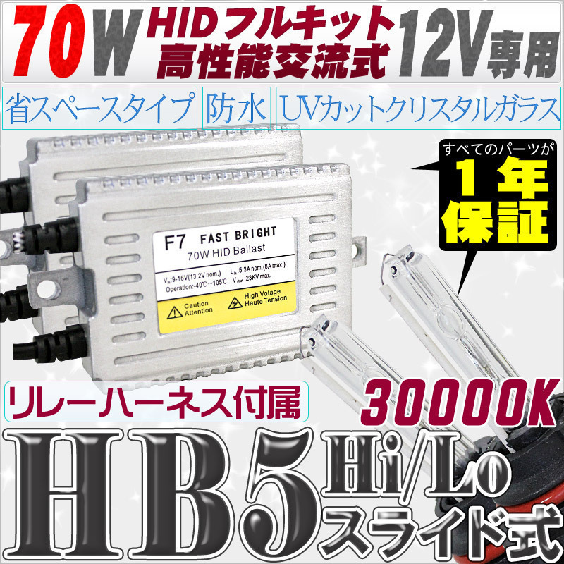 - 高性能 HIDキット 70W HB5 Hi/Loスライド式 リレー付 30000K 【交流式バラスト&クリスタルガラスバーナー】 12V用
