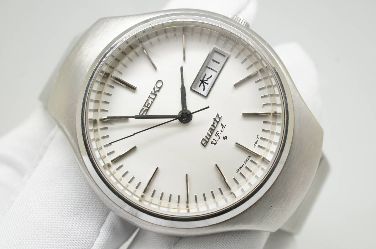 > J13●作動良好 SEIKO セイコー V.F.A. 3823-7000 1971年製 カットガラス ラウンドケース型 デイデイト メンズ腕時計 シルバー クォーツ