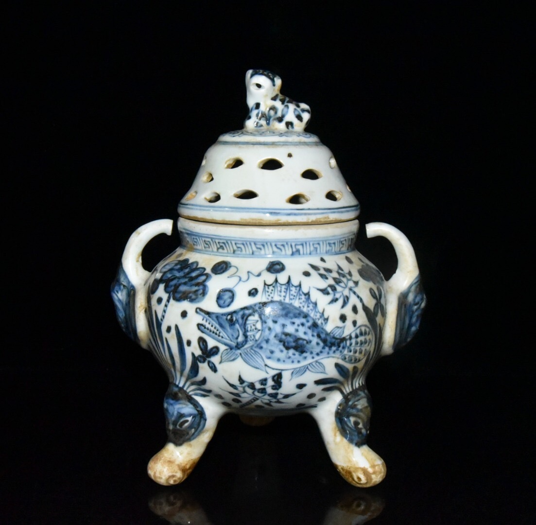 - 蔵友旧蔵出 元 青花 魚草紋 三足熏香爐 稀少珍品 貴重品 古陶瓷品 置物 古賞物 中国古玩 中国古美術品