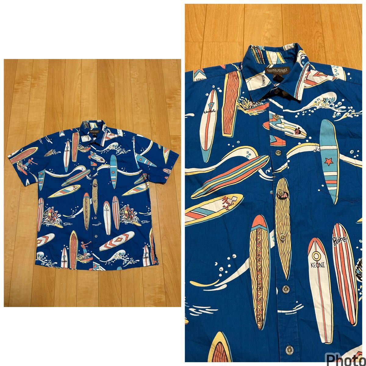 > 良品☆COOKE STREET・HAWAIIAN ISLANDS サイズM大き目.日本XL〜並 半袖シャツ型アロハシャツ サーフボード&サーフィン.波 オールド調総柄