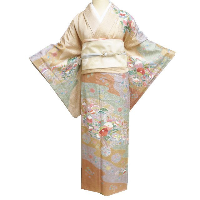 - 訪問着 着物 未使用 正絹 袷 フォーマル 流水に花の図 香色 多色 金 身丈161cm 裄66cm M きもの北條 A1281-4