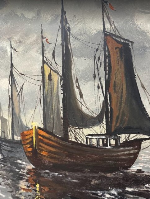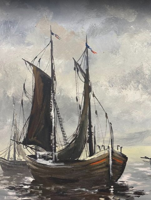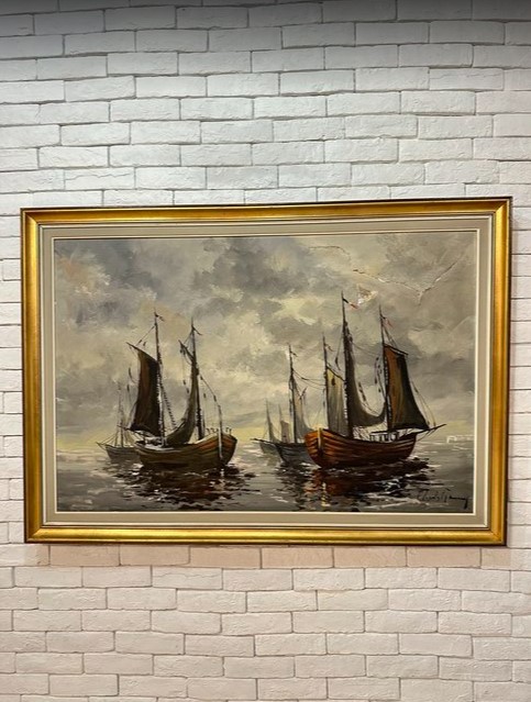 - 4667 【都内23区は配送無料!!】横幅134cmの大きな油絵 フランス買い付け品 静かな海と船の絵 油絵 風景画 ヨーロッパ bb