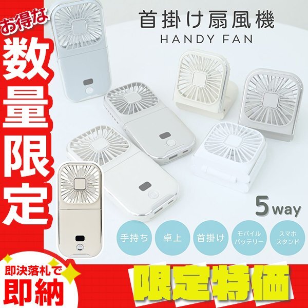 - 【限定セール】首掛け 扇風機 5way ハンディファン 携帯扇風機 折りたたみ 充電式 モバイルバッテリー スマホスタンド アイボリーホワイト