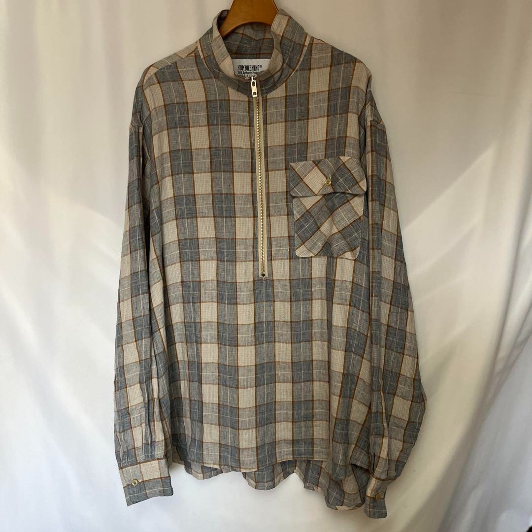 - HOMBRE NINO ハーフジップ リネン チェック シャツ ブルゾン XL