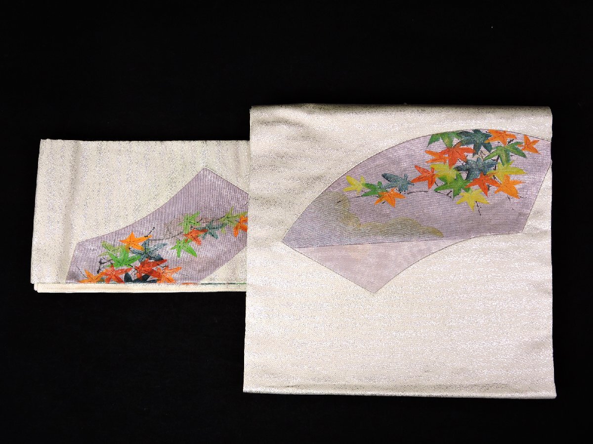 > 【中古】名古屋帯 名古屋仕立て 白 紅葉 着物 カジュアル お出かけ