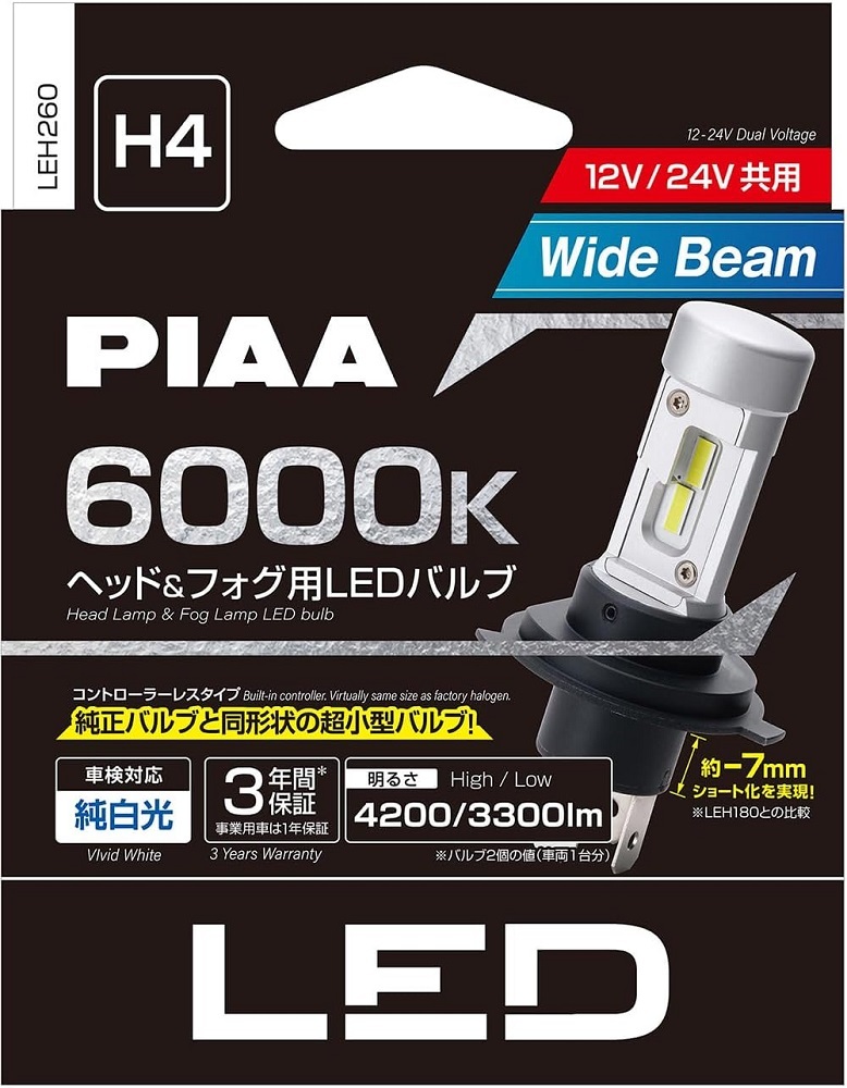 - PIAA LEH260 LEDヘッドライト/フォグランプ ワイドビーム6000K 4200lm/3300lm DC12V/24V共用 18W H4 車検対応 3年保証