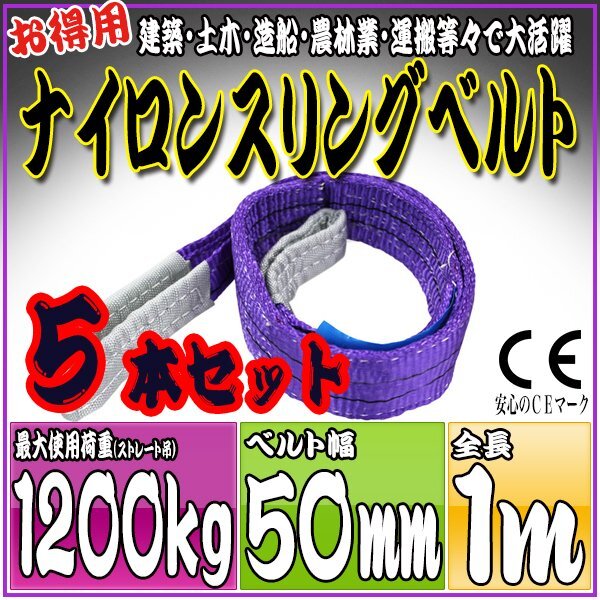 - スリングベルト 5本セット 1m 幅50mm 使用荷重1200kg 1.2t 吊りベルト ベルトスリング [ナイロンスリング 吊上げ ロープ 牽引 運搬]