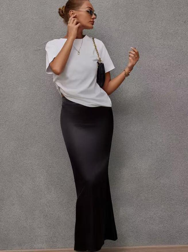 - M1211 スカートレディース● 着心地抜群 20代30代40代 ●大活躍 光沢 ロング丈 black