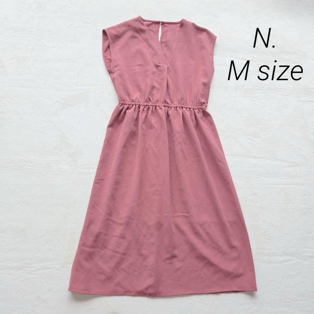 - N. ワンピース 膝下丈 M ノースリーブ エンジ色 Vネック なめし生地風