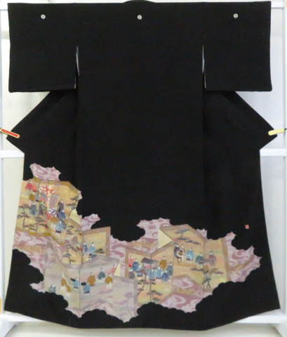 - 《古美術京松》【着物】黒留袖 五つ紋 御所車に大名行列文 金駒刺繍 比翼仕立て 作家落款 身丈約149cm 裄丈約63cm kyo7z05-409