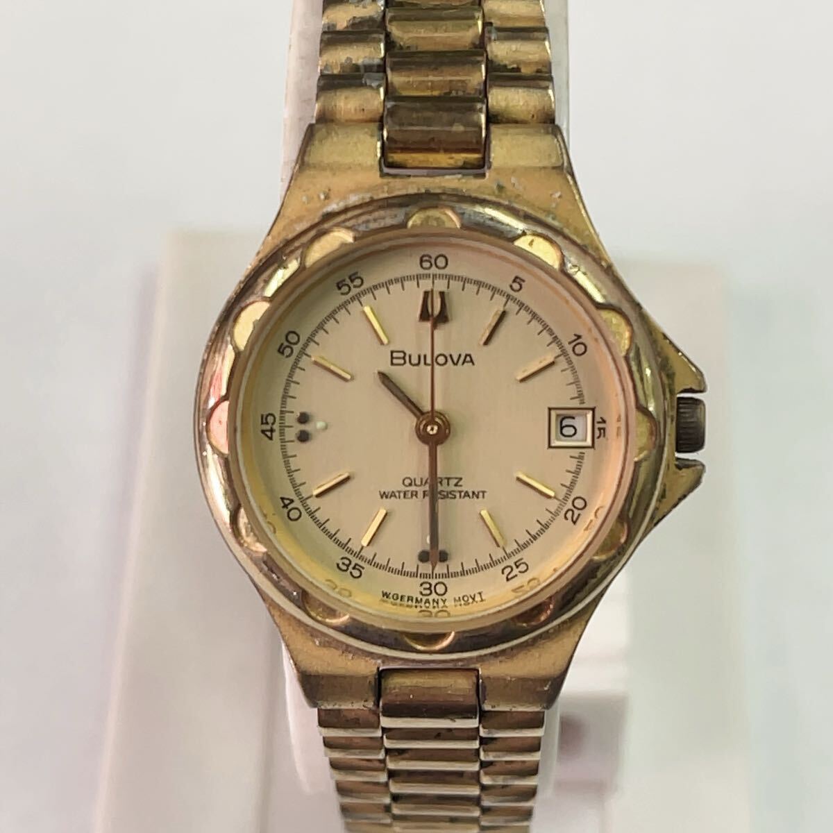 - 稼働品 BULOVA ブローバ 9063-5020 ゴールド文字盤 デイト ラウンド レディース腕時計