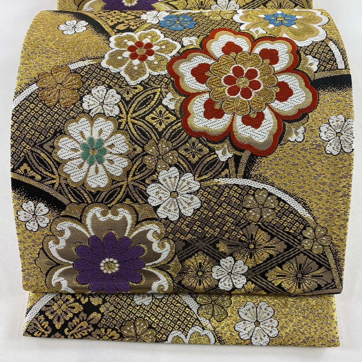 - 【美品】 袋帯 秀品 振袖向き 桜 有職文様 金糸 箔 金色 六通 正絹 【中古】