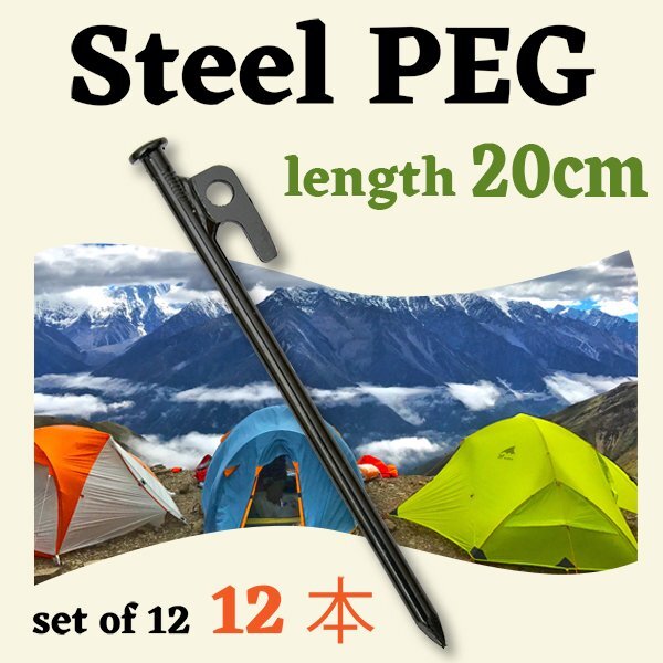 - 送料無料 スチールペグ ペグ スチール製 12本 20cm 高強度 引抜穴付きペグ テント タープ 設営 キャンプ DIY BBQ 野外フェス バーベキュー