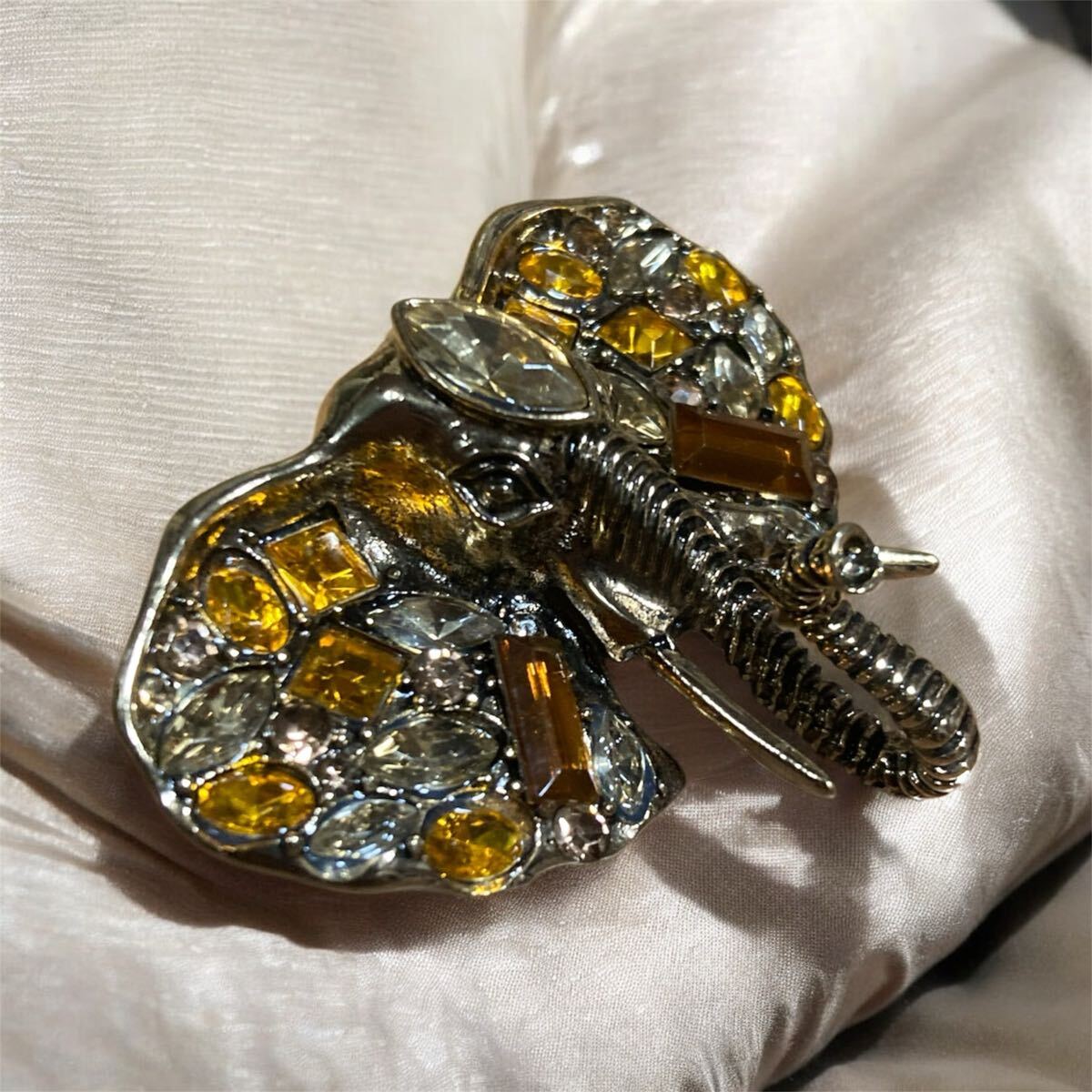 > 【高品質】エレファント 金属製 ブローチ 重厚感 ラインストーン アンティーク アクセサリー カラーストーン ゴールドカラー