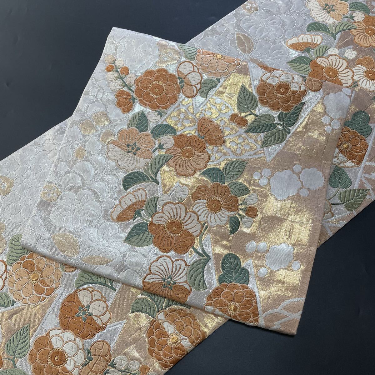 > #G165 袋帯 六通 西陣織 西陣織 金銀糸 菊 椿 菱文 正絹 和装 和服 フォーマル帯【wellriver】