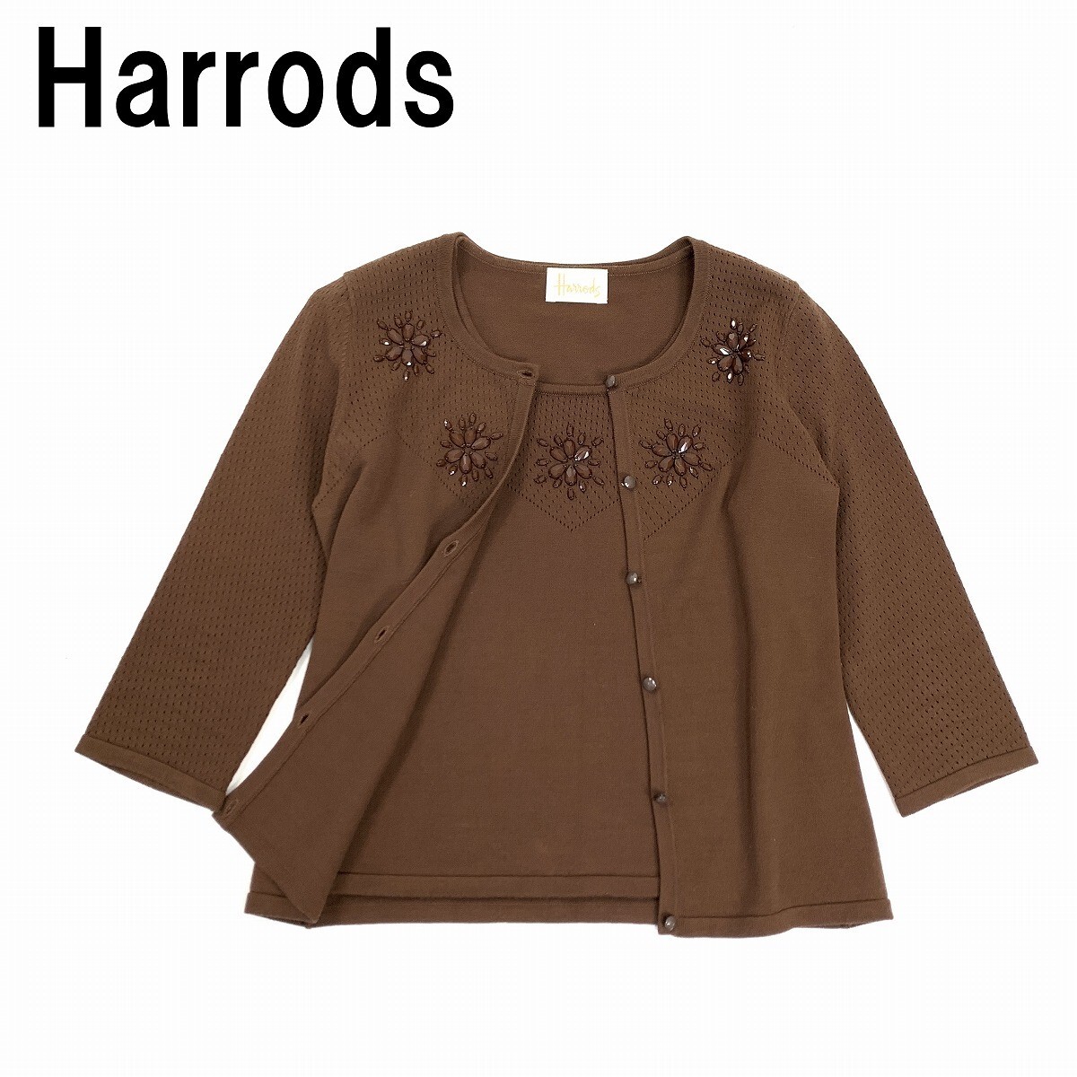 - Harrods ハロッズ ニットアンサンブル レーヨン 半袖 七分袖カーディガン ビジュー 茶色 ブラウン M相当 YC1161