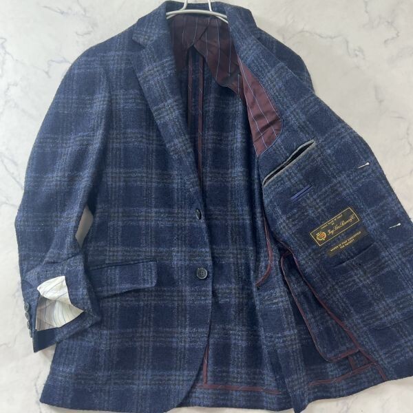 > 美品 ロロピアーナ バケットロンドン テーラードジャケット チェック柄 パイピング 裏地ストライプ ネイビー LORO PIANA メンズ B1610