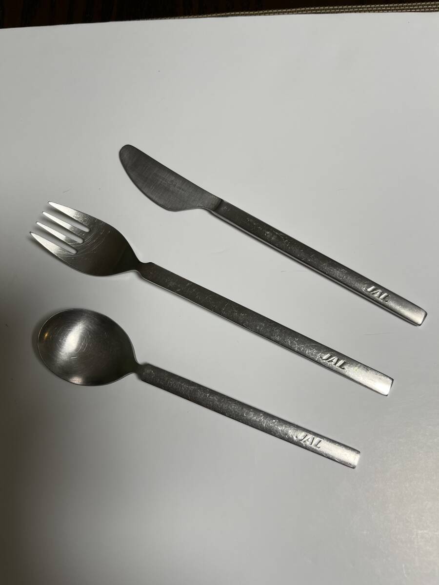 - 希少 旧ロゴ JAL日本航空 カトラリー バターナイフ、フォーク、スプーン3点 Martian製 USED