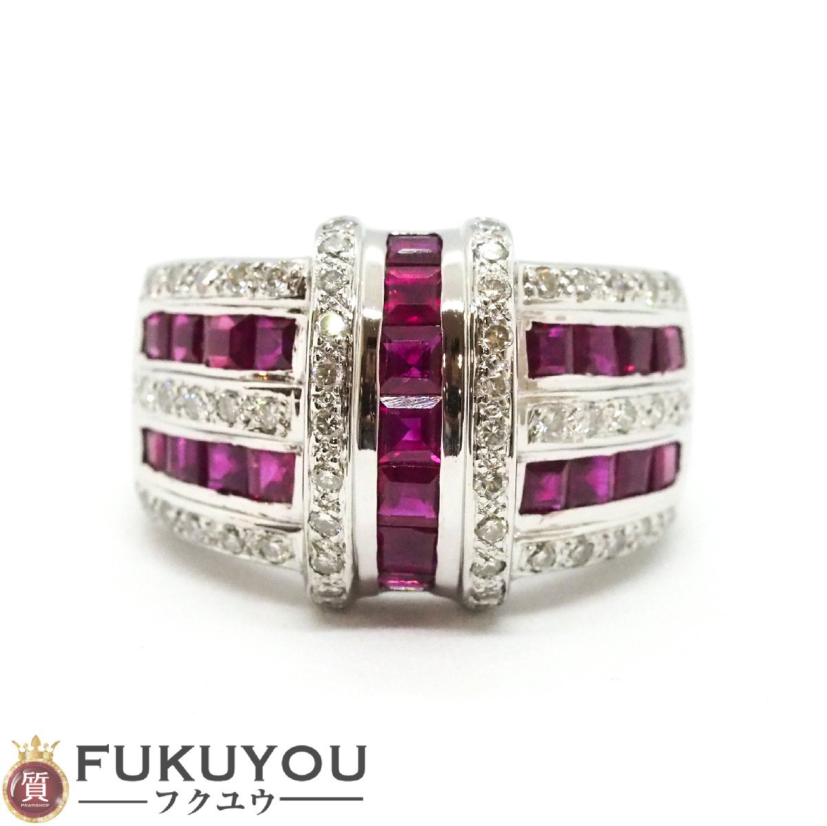 > K18WG 天然コランダム ルビー 2.95ct メレダイヤモンド 0.60ct 付 ホワイトゴールド リング 14.1g 13.5号