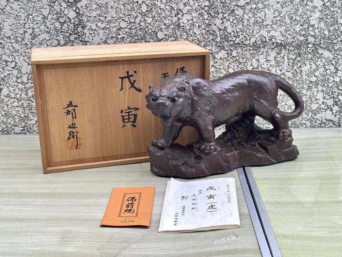 - 【うぶだし品】五郎辺衛窯造 備前焼 干支置物 戊寅 題名 虎視眈々 在銘 陶印 共箱 インテリア/オブジェ/縁起物/骨董/美術品/茶道具 :YU