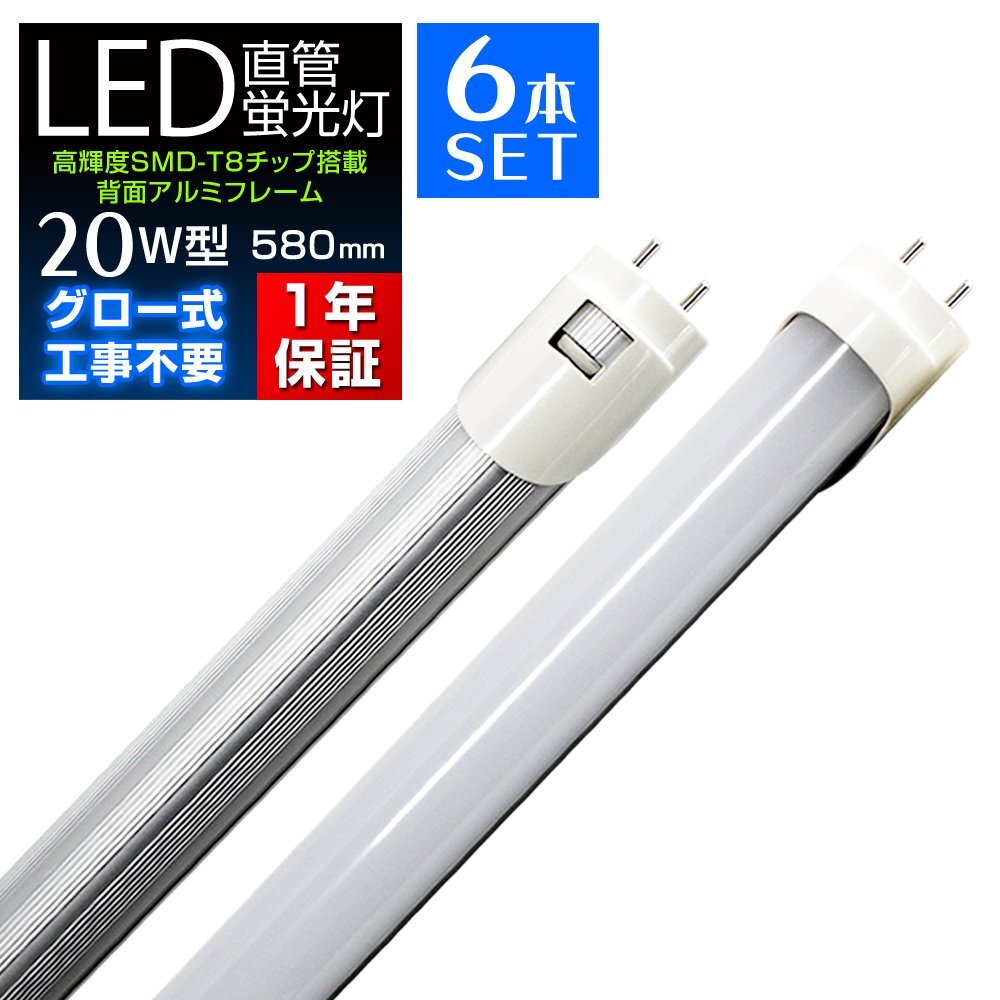 - 【6本セット】1年保証付き 直管 LED蛍光灯 1本 20W型 昼光色 580mm 約58cm グロー式 工事不要 SMDチップ LEDライト 照明 店舗 事務所