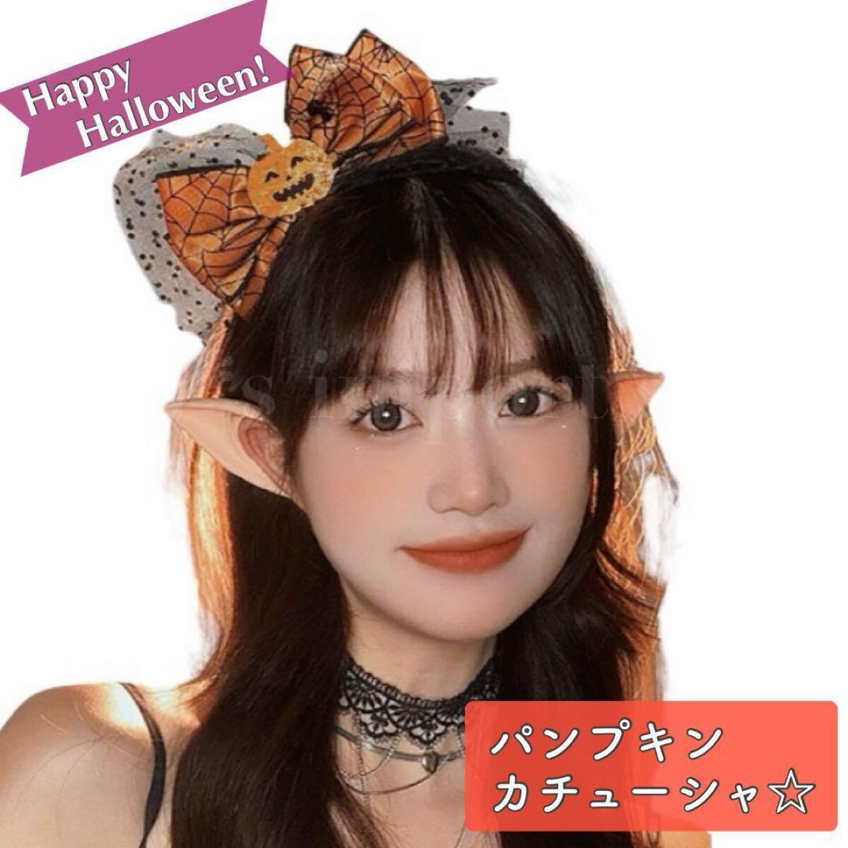 - ハロウィン カチューシャ レディース 女の子 子供 大人 かぼちゃ パンプキン りぼん 黒レース オレンジ