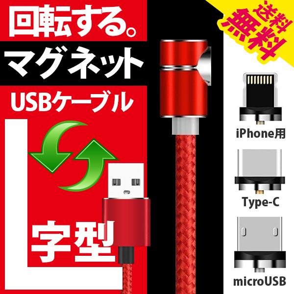 > iphone/android 用 L字マグネット スマホ 充電 ケーブル TYPE-C/MicroUSB/iPhone 3種類のアダプタセット 1m ゲームに ネコポス 送料無料