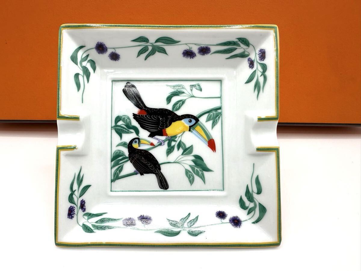 > 美品 HERMES エルメス アッシュトレイ 灰皿 オオハシ鳥 ヴィンテージ 陶器 骨董 非売品 スクエア 小物入れ インテリア