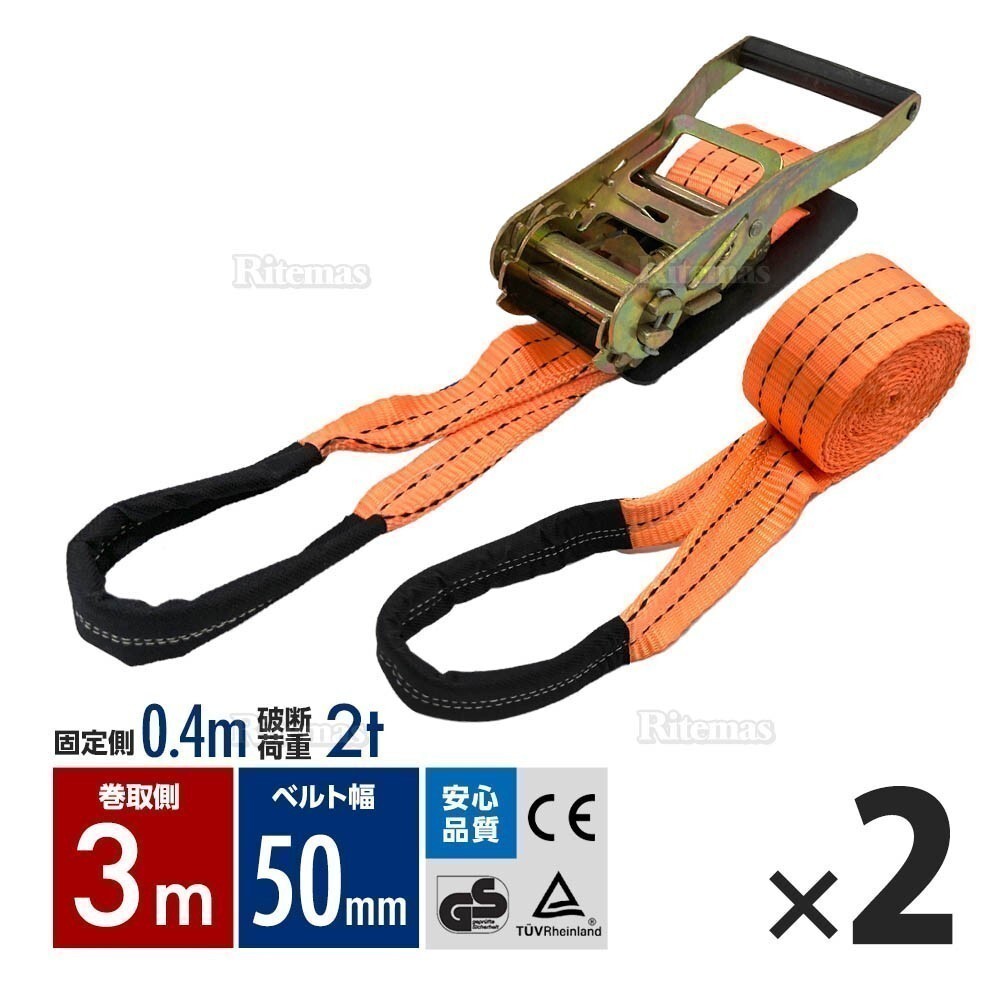 > ラッシングベルト ワッカ トラック用 幅 50mm ラチェットベルト ラチェット式 固定側0.4m 巻側3m 荷重2000kg タイダウンベルト 2本 1年保証