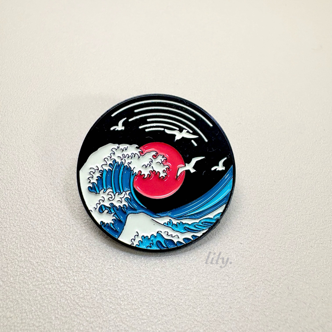 - 【ピンバッジ】津波 北斎 レコード盤