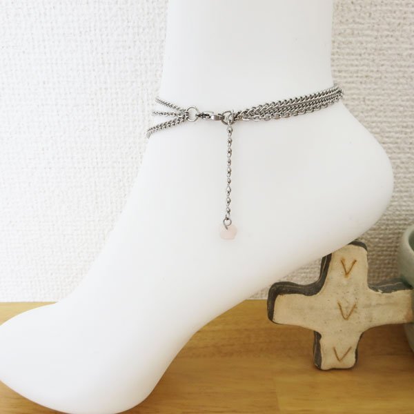 - 3連ステンレスチェーンアンクレット 全長約 27cm(23cm+4cmアジャスター)ローズクォーツFN84