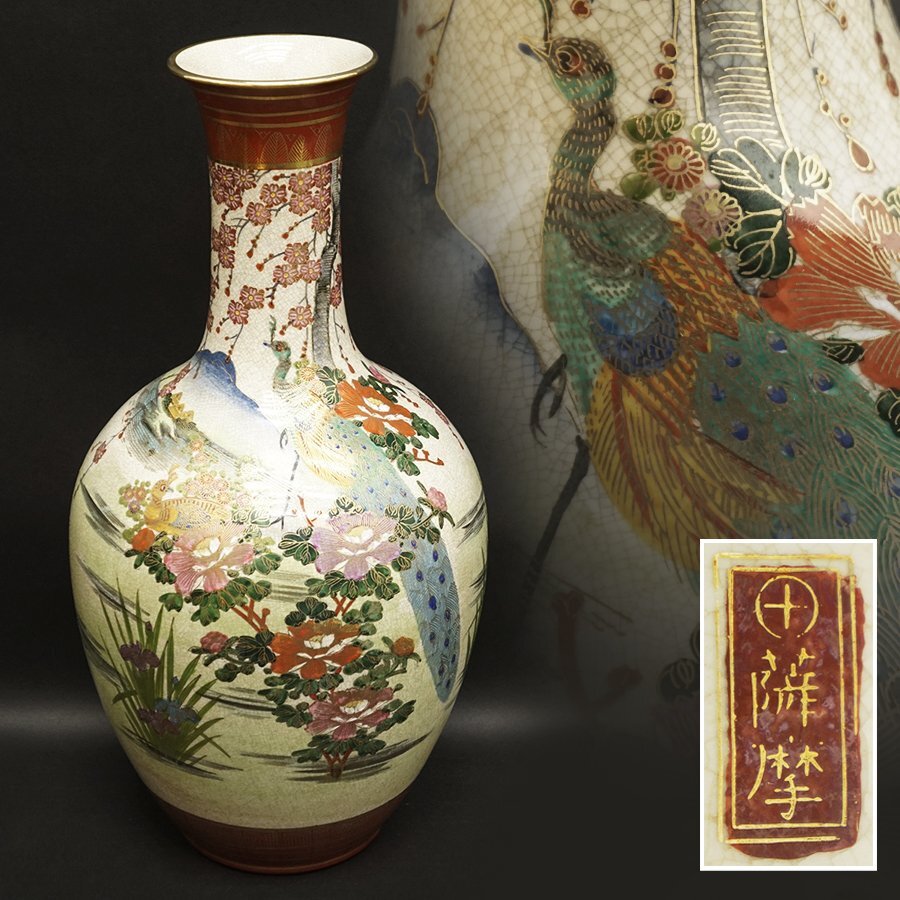 - 薩摩焼 丸十字家紋 花鳥図文 花瓶 花生 花器 飾壷 陶芸 陶器 陶製 陶磁 時代 飾壷 飾瓶 骨董 工芸 茶道具 煎茶道具 高さ55cm 古美術品
