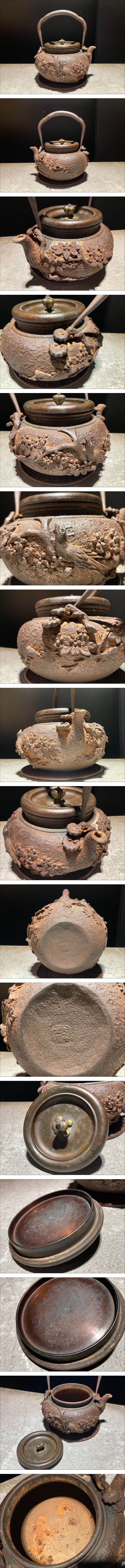 - ■上田照房造 花鳥霊芝盛上 平丸形 鉄瓶■g煎茶 急須 湯沸かし 鉄壺 鉄器 金属工芸 茶道具 時代物 古美術_