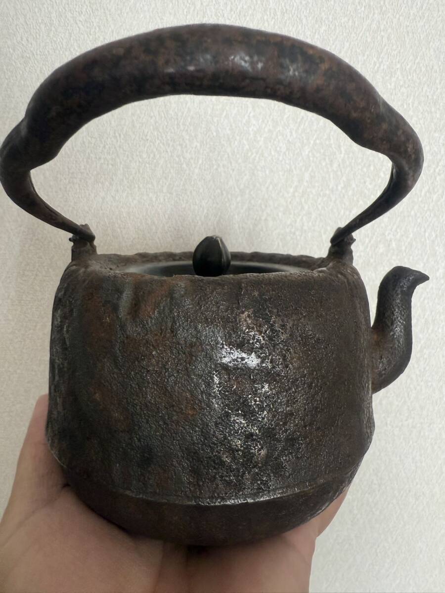 - 【正】明治期 龍文堂名人造 道安型 小振り 大岩肌古鉄瓶 満水約700ml 高さ約18.5cm 横約15cm 水漏れなし